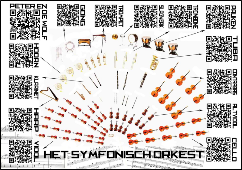 Hieronder zie je een afbeelding van een symfonisch orkest. Een dergelijk orkest bestaat voornamelijk uit 4 instrumentengroepen, namelijk de strijkinstrumenten, de houten blaasinstrumenten, de koperen blaasinstrumenten en het slagwerk. Naast deze 4 instrumentengroepen zijn er één of meerdere harpen aanwezig. Vaak kan je hierbij ook nog een piano terugvinden. De piano staat niet op deze afbeelding, maar als deze aanwezig is, staat die vaak achter de harpen. (links aan de zijkant)